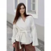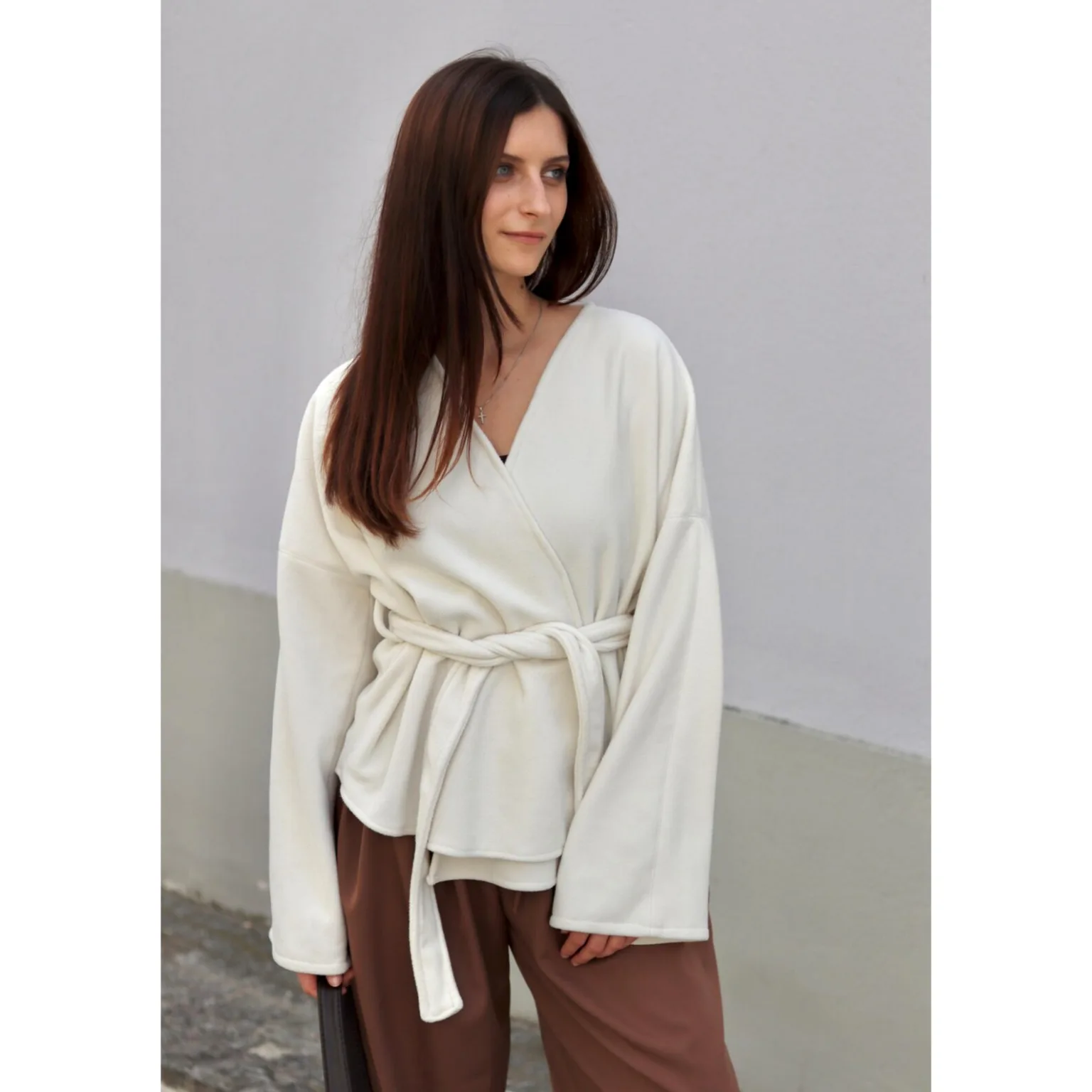 Upgrade your handmade wardrobe with this elegant Belted Coat Sewing Pattern. Designed for adventurous beginners, this robe-style coat combines comfort and timeless style. Featuring an open front, shawl collar, dolman sleeves, and a waist tie, it’s perfect as a chic bridal robe, cozy coat top, or everyday short robe.