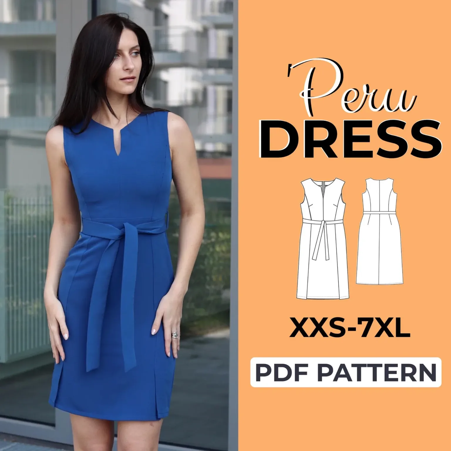Sew your next statement dress with elegance and precision using this Belted Sheath Dress Sewing Pattern—a digital PDF pattern designed for experienced sewists who want a sleek, structured silhouette with refined details. This midi-length fitted dress features a sleeveless bodice, a flattering V-neckline, and a waist tie that adds shape and visual balance.