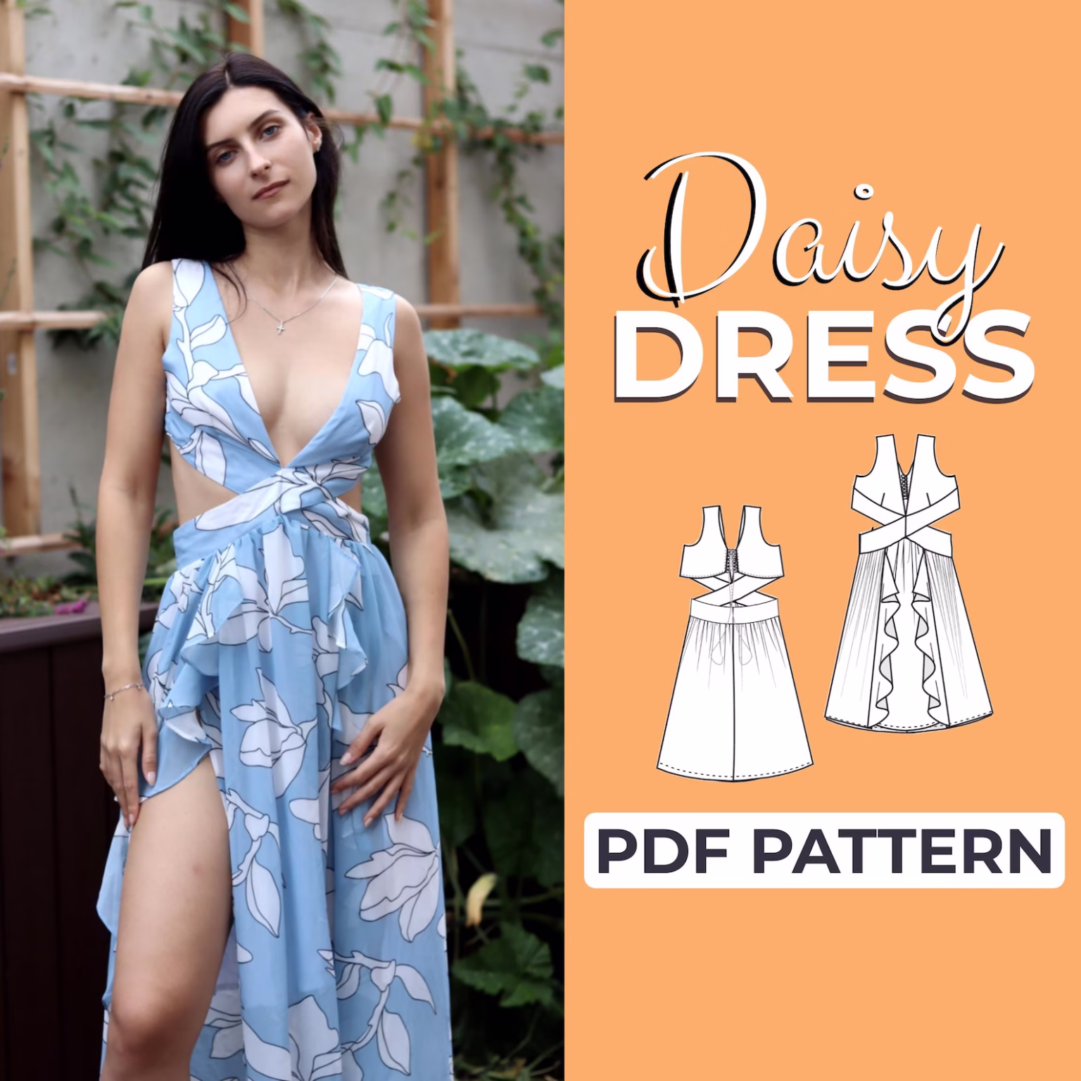 Sew your own elegant Floral Cutout Dress with this expert-level pattern! Designed for sewing enthusiasts who love a challenge, this digital PDF pattern includes sizes XXS to XXXL. It features a plunging V-neckline, a high-slit wrap front, a floor-length silhouette, and delicate cutout details. Perfect for special occasions or a breezy summer look!