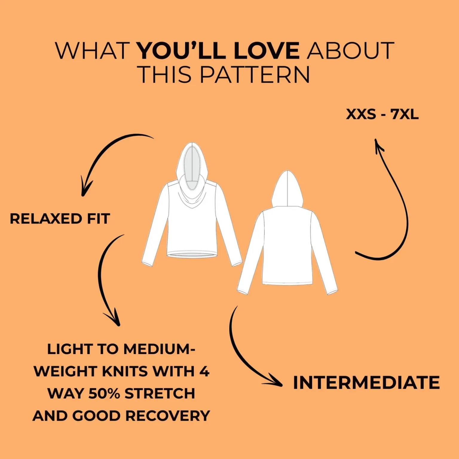 Create a sleek, modern garment with this Hooded Cowl Neck Top Sewing Pattern, carefully designed for sewing enthusiasts who want both comfort and style. Not only does this pattern feature a beautifully draped neckline, but it also includes an attached cowl-style hood that adds depth, structure, and a distinctive fashion-forward look. As a result, you can sew a versatile hoodie that works perfectly as a casual top, light jacket, or layering sweater for everyday wear.