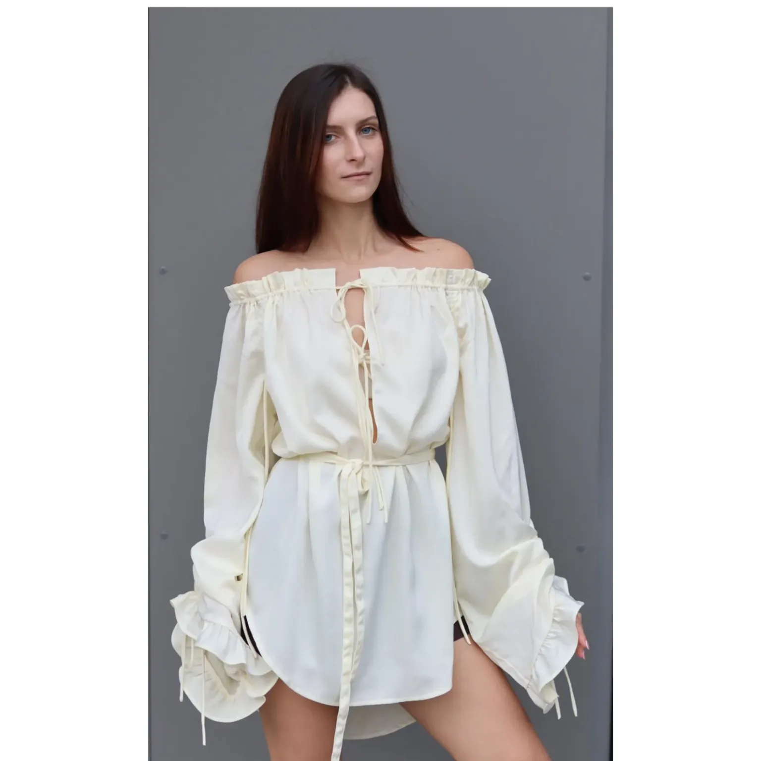 Create a flowy, elegant oversized blouse with this Long Sleeve Peasant Blouse Pattern, perfect for sewing enthusiasts who want a comfortable yet stylish top. This intermediate-level sewing pattern features an adjustable drawstring neckline, V-neckline with ties, roomy sleeves with drawstring tie accents, ruffled hemmed sleeves, and a self-tie belt, allowing you to craft a versatile blouse suitable for casual wear, festival outfits, or statement layering pieces.