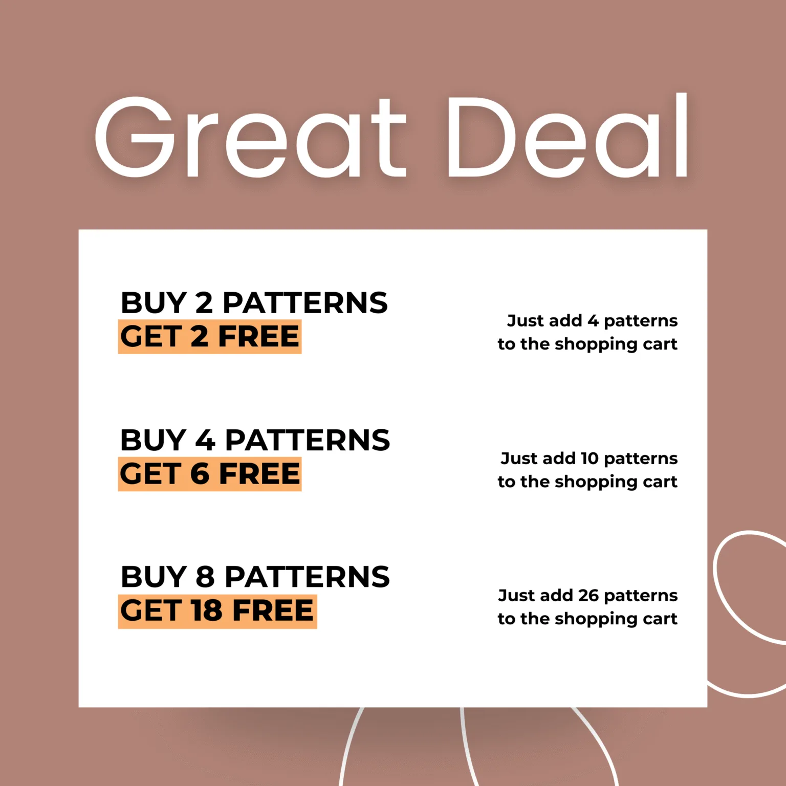 Buy 2 patterns, get 2 free | Buy 4, get 6 free | Buy 8, get 18 free. Learn more