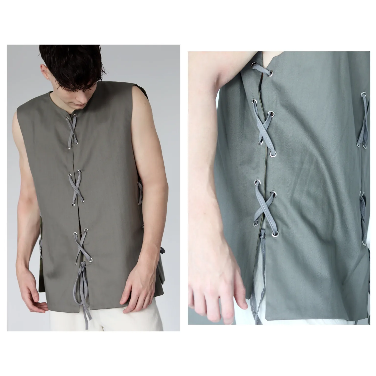 • Short version: 1 yard of fabric; long version: 1.5 yards of fabric. You’ll also need optional eyelets/grommets and lace for closures.