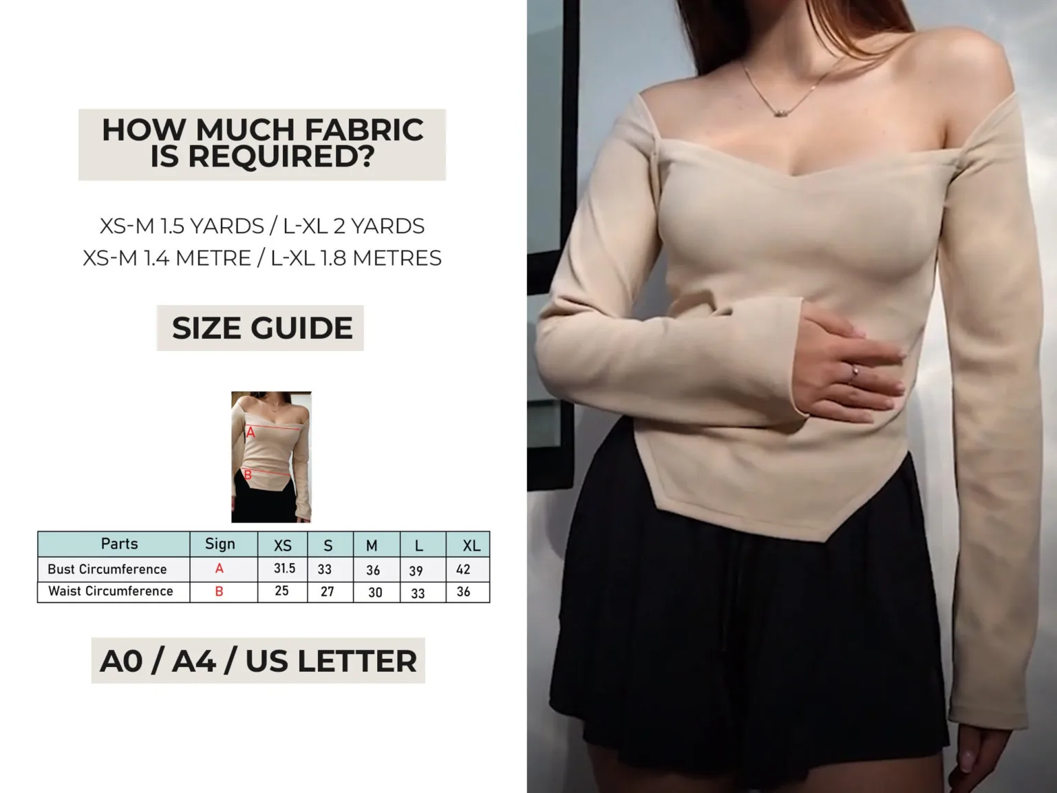 For this project, we recommend using soft, medium-thick, or thick stretchy knit fabrics to get the best fit and feel. If you’re working on sizes XS-M, you’ll need 1.5 yards of fabric, while sizes L-XL will require 2 yards. This off the shoulder top pattern is incredibly versatile, allowing you to create a range of looks—from casual to elegant.
