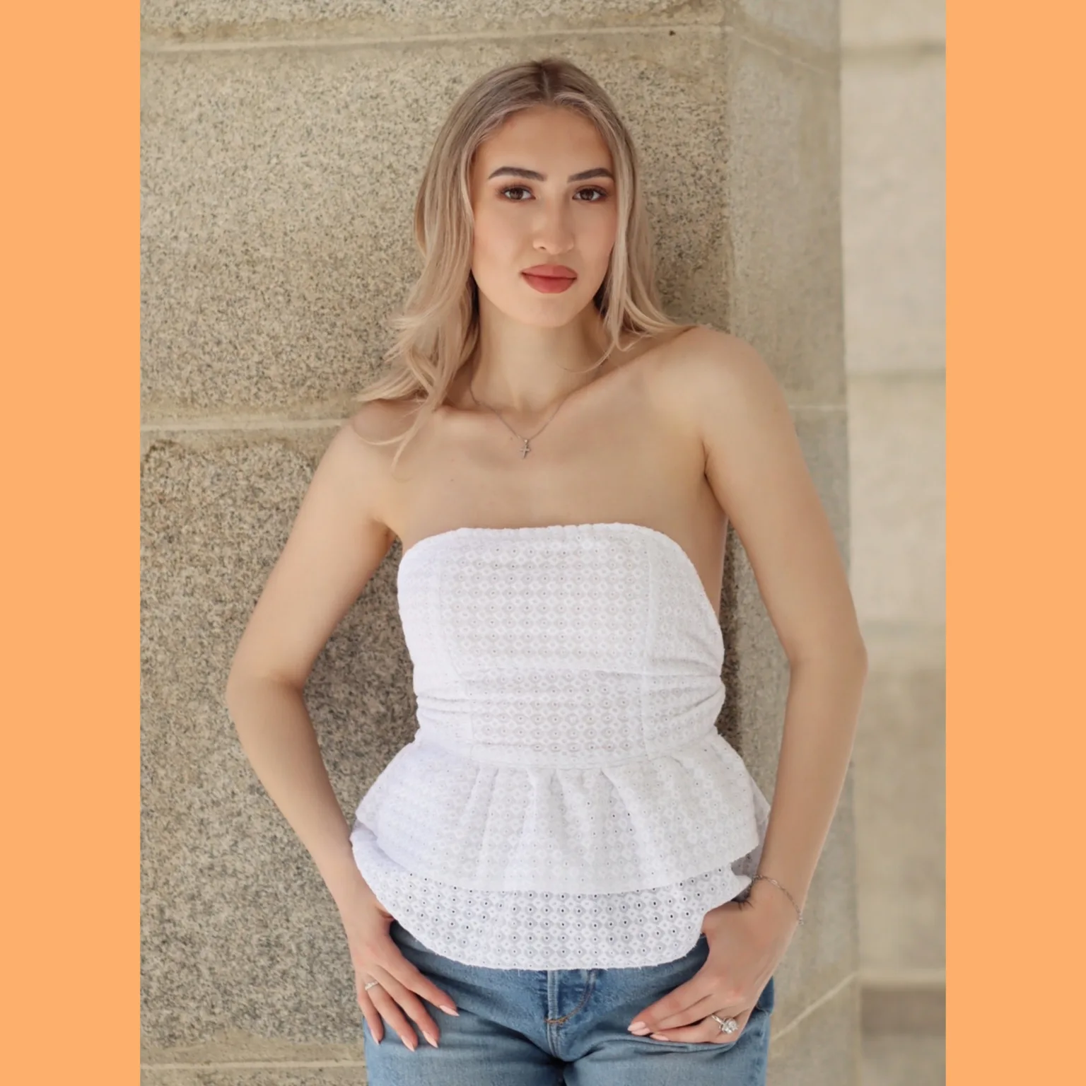 • Double layer peplum skirt adds flair and style