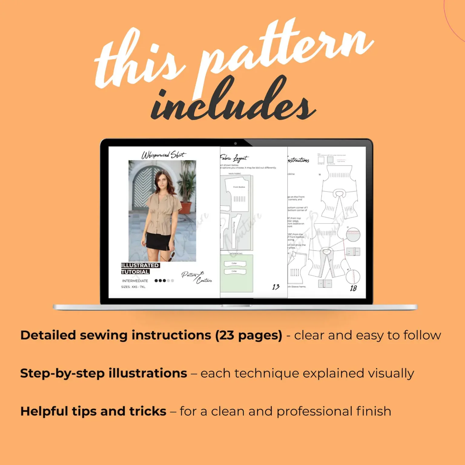 Create a timeless, airy wardrobe essential with this beautifully constructed Pleated Waist Blouse Sewing Pattern, designed for sewing enthusiasts who enjoy thoughtful details and polished finishes. This relaxed short-sleeve blouse features a button-front closure, elegant pleats at the front and back, and a classic collar, making it ideal for everyday wear, work outfits, or elevated casual styling.