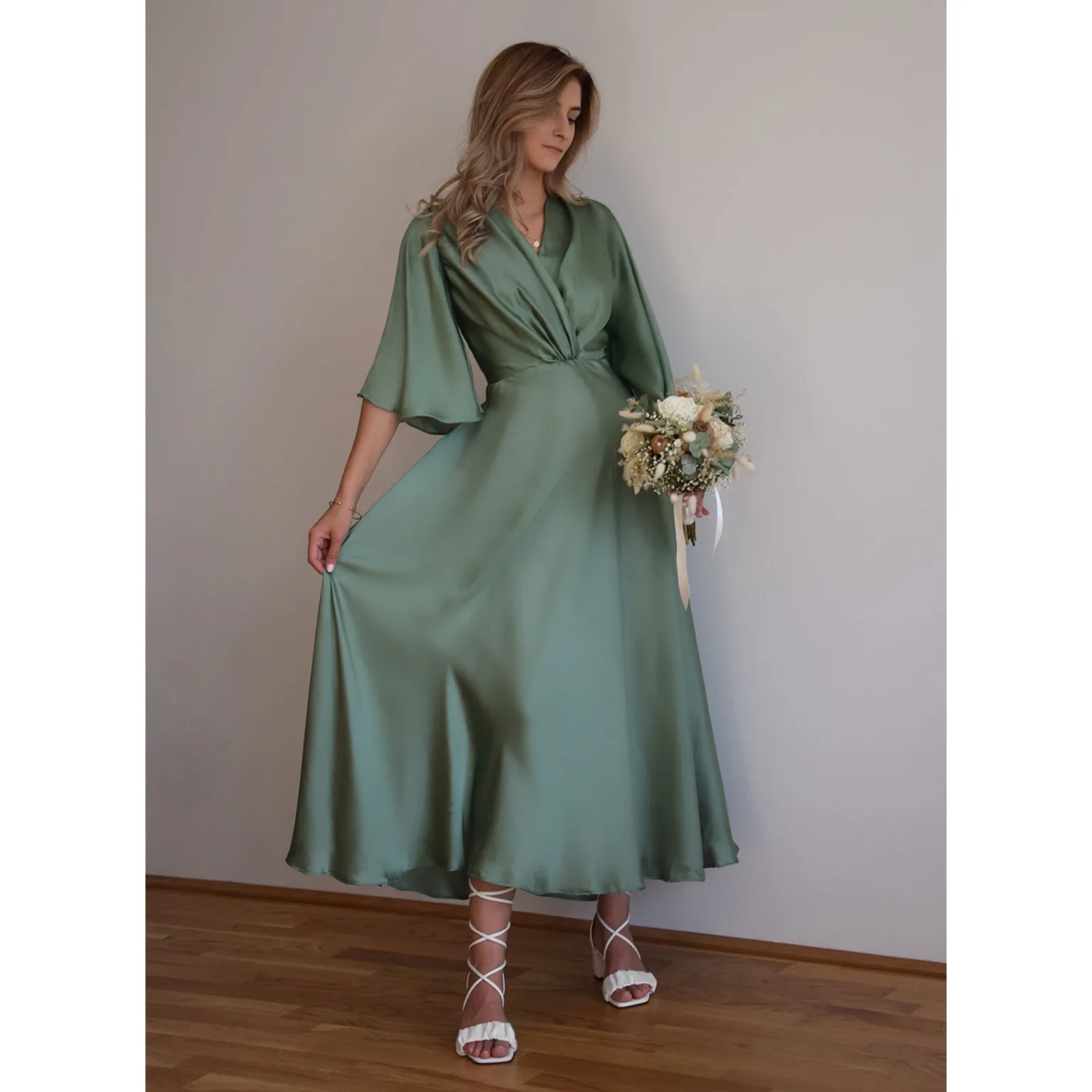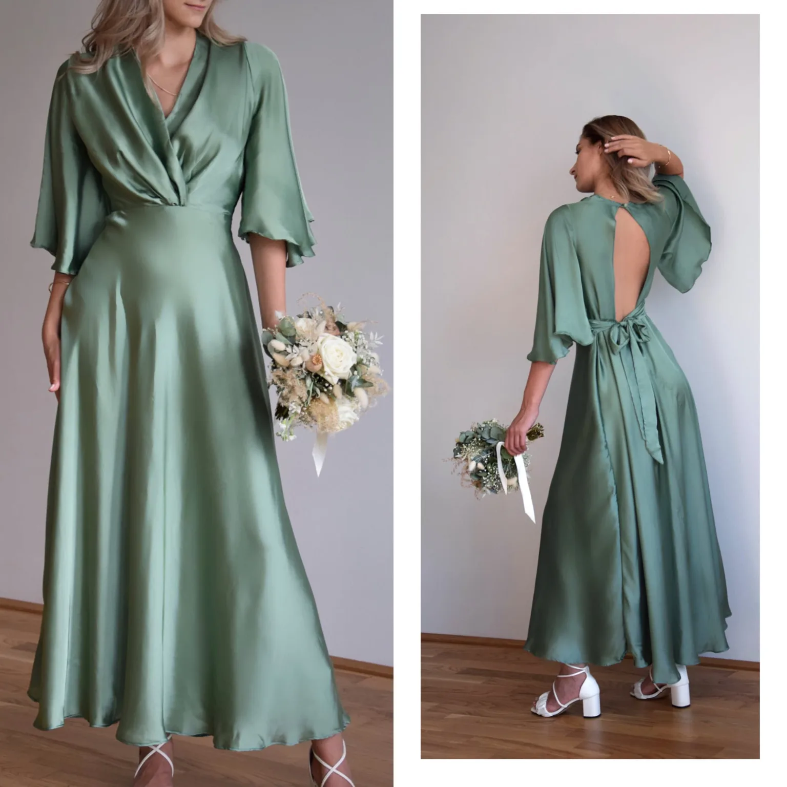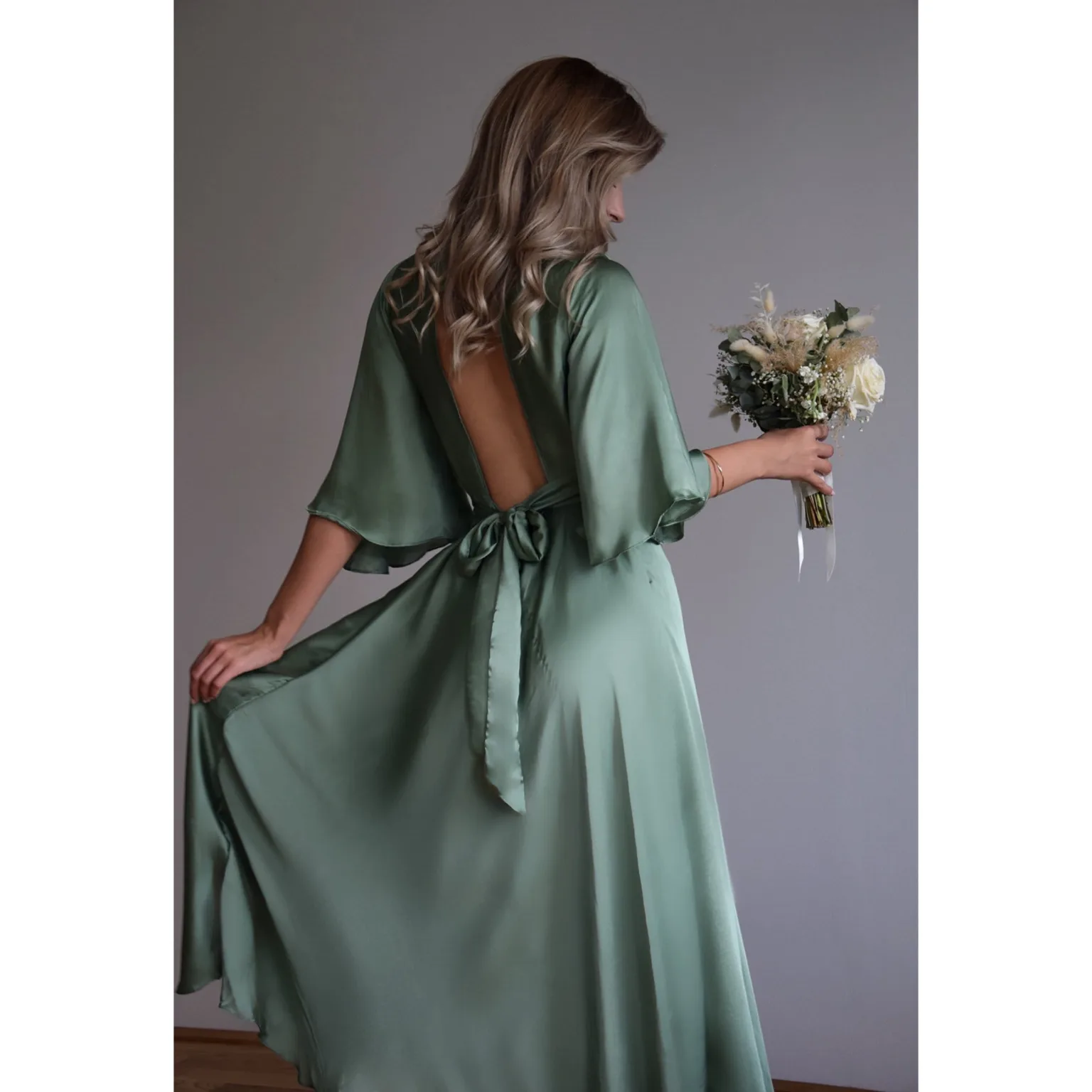 This gown features a flattering wrap bodice, flowing A-line skirt, and chic sleeves. This dress is perfect for any special occasion. With an open back design and adjustable waist tie, you’ll feel both elegant and confident. Create your masterpiece and turn heads wherever you go!
